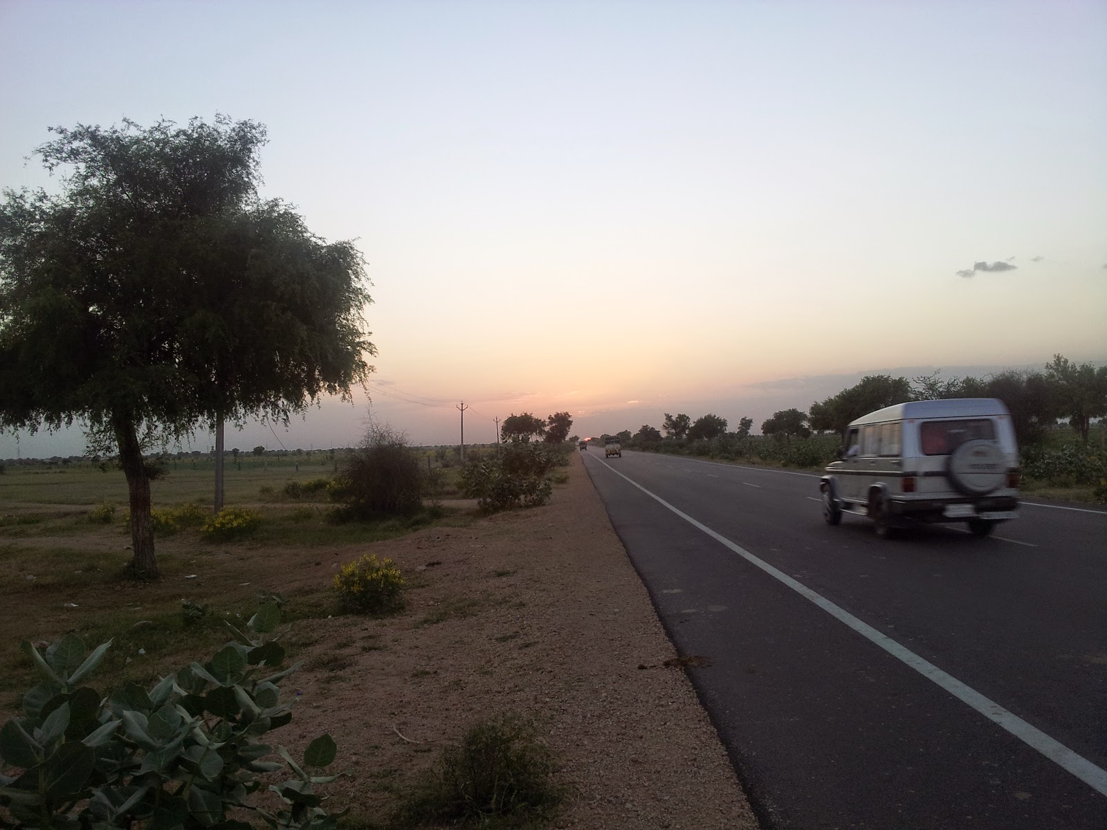 6.25pm, We had planned to see sunset at Sam sand dunes in Jaisalmer, but as all our plans were failing, this one too failed. We had to see the sunset at NH15 itself. In the picture (above) you can zoom-in and see sunset at the end of the road. Now it was getting dark, and by dark I mean pitch dark as there was no street lighting, no settlements along the road on NH15. And still we were more than 150+ km away from our pit stop. We had decided that we will not drive in the night, but had to break that rule. There was no other option, as there were no hotels, motels or inns that we could see. So we drove in the dark. The traffic coming from the opposite direction was using high-beams, so it was getting very difficult to drive as we could not see the road ahead. So we also started driving at high-beam, and whenever we saw any vehicle's headlights coming towards us, we switched to low beam, the other vehicle also acknowledged this by switching to low-beam. So now the only problem left was driving in the dark. At night we were still able to maintain a speed of 80kmph. And we had to drive fast because we can not afford to lose more time to reach Jaisalmer. Below pictures are also taken at the time of sunset. In the pictures you can see the sun setting at one end of the road, and the moon rising at the other end of the road.