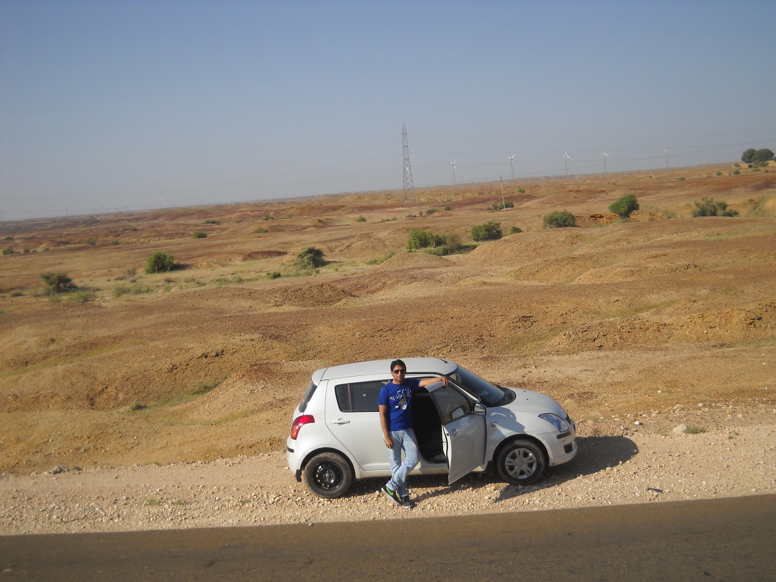 10:17am, we were travelling in Rajasthan from so long, but no signs of sand so far. We thought Rajasthan will be all about sand and camels, but we were illuded from the sand of the great Thar desert so far. But then the road took a steep down slope, and we saw the sand for the first time. Here are the pics (below).